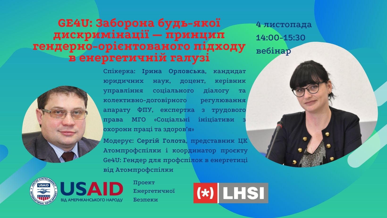 Перший вебінар «GE4U: Заборона будь-якої дискримінації — принцип гендерно-орієнтованого підходу в енергетичній галузі» відбудеться 4 листопада 2021 року з 14:00 до 15:30.