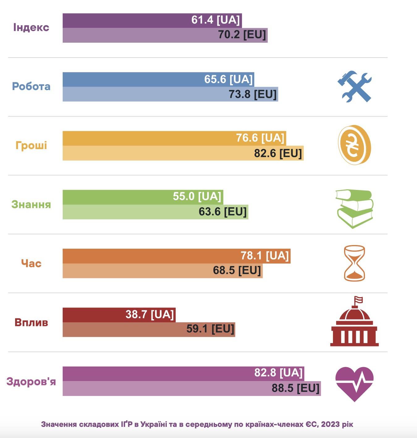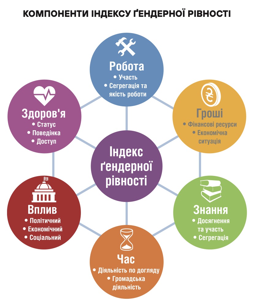 Згідно з нещодавно опублікованим Індексом ґендерної рівності, Україна посідає 20 сходинку серед 27 країн ЄС за загальним індексом, а найближчі до середньоєвропейських показники отримані у сферах: «Здоров’я», «Гроші» та «Час». Комплексний аналіз проводився вперше в Україні за шістьма ключовими сферами: «Робота», «Гроші», «Знання», «Час», «Вплив» і «Здоров’я» та стане постійним інстрментом в процесі інтеграції України до ЄС.