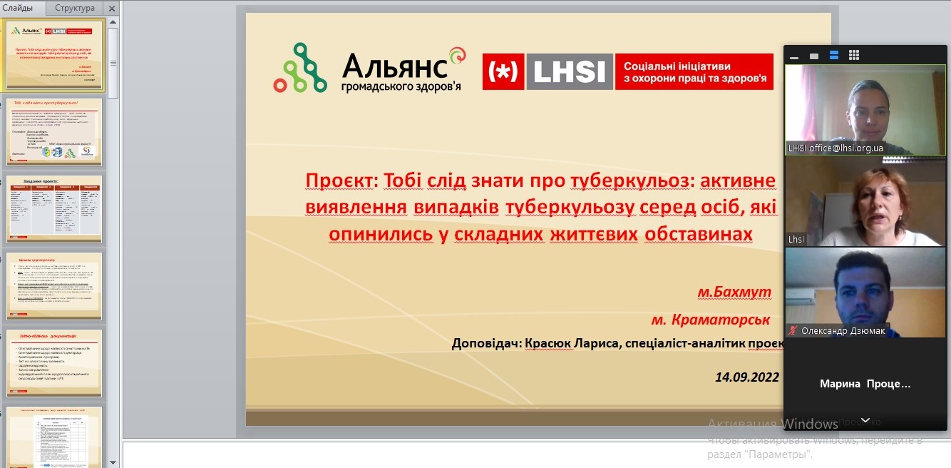 У рамках проекту «Тобі слід знати про туберкульоз: активне виявлення випадків туберкульозу серед осіб, які опинились у складних життєвих обставинах», який реалізується МГО «Соціальні ініціативи з охорони праці та здоров'я» (LHSI) за підтримки Альянсу громадського здоров'я, команда LHSI на постійній основі проводить зустрічі-навчання з соціальними працівниками залучених до проекту. Такі зустрічі мають на меті допомогти виконавцям удосконалити свої професійні знання та вміння, збільшити цілеспрямованість професійних дій.